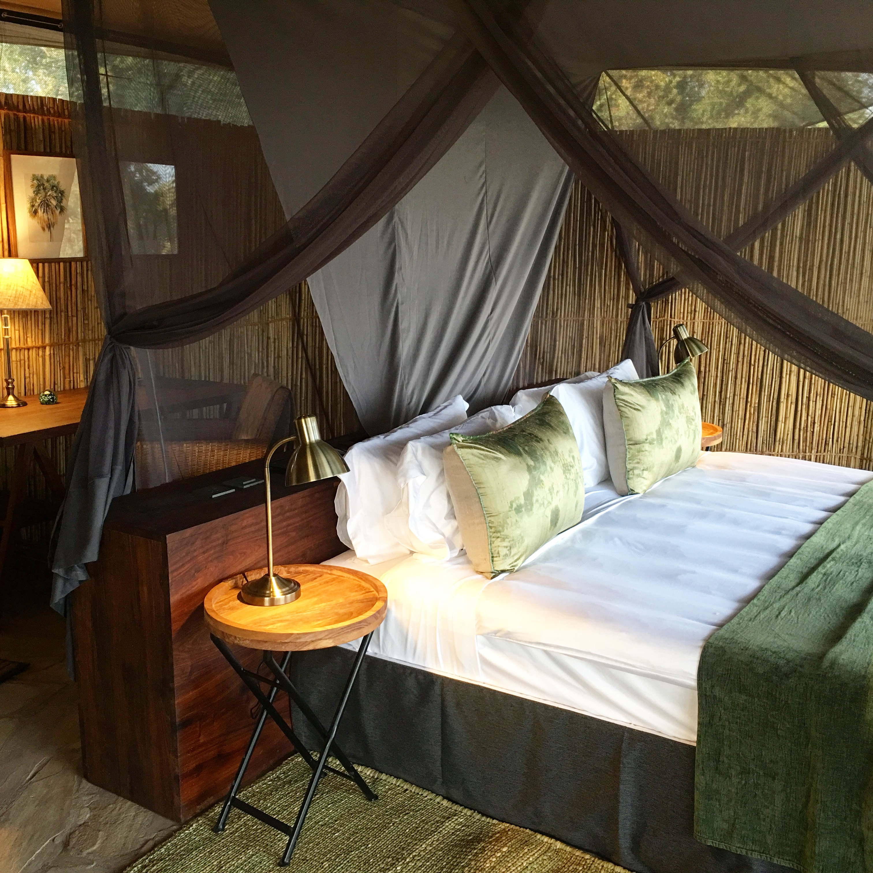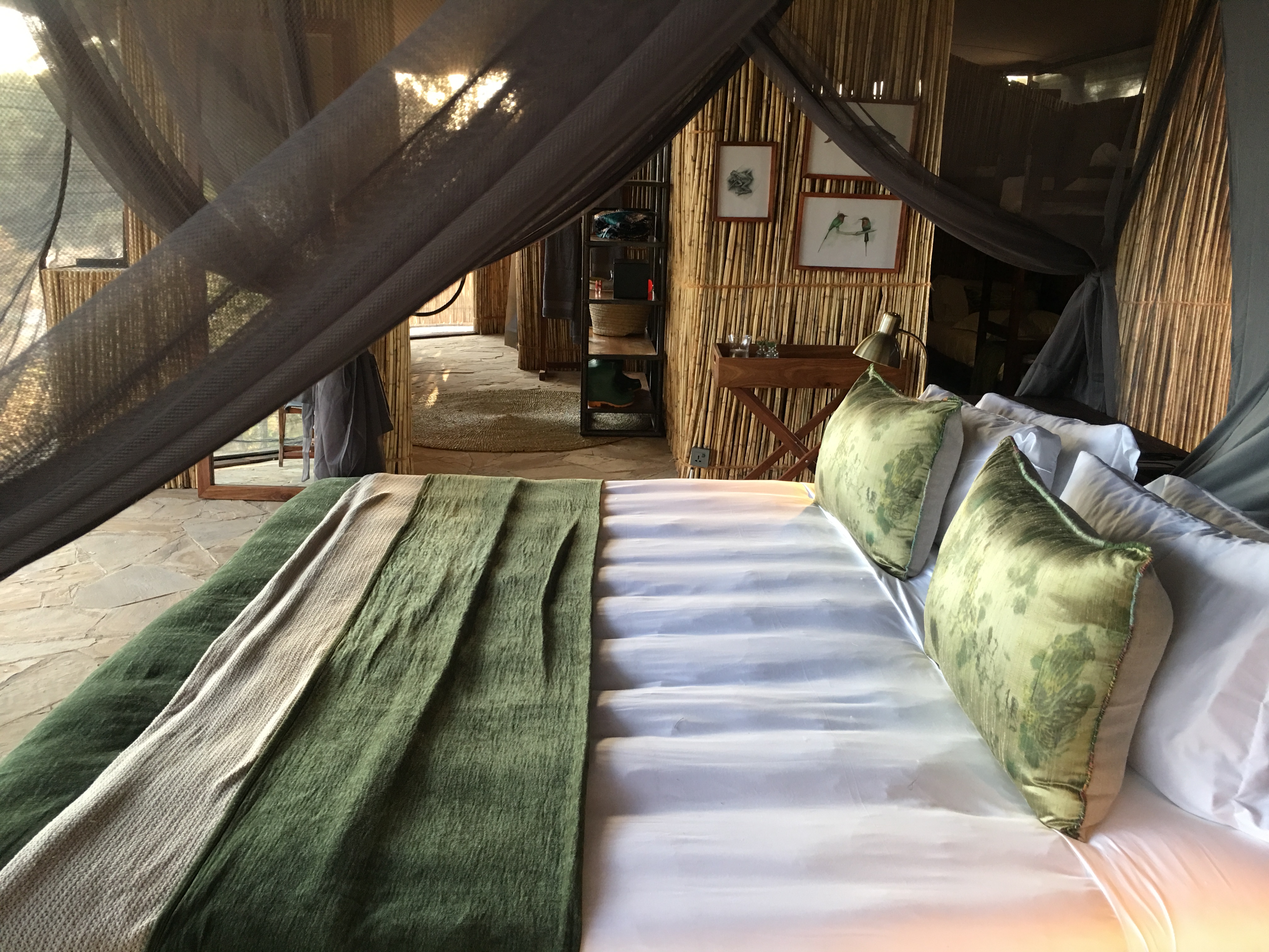 It’s not difficult to find inspiration when you have Africa’s largest Game Reserve as your muse. We wanted to build a camp that not only provided guests with luxurious accommodation but also reflected the very essence of what Selous is all about – raw, wild and untamed Africa. The view stretches from the camp out towards a tributary of the Rufiji River, which is dotted with borassus palms along its banks. I used subtle hues of blues, greens and greys combined with textured reed walls, stone floors and hand-woven grass carpets to give the interiors a natural but modern feel. The reeds were all sourced locally and the traditional grain stompers, turned pot plants, were from the Tanzanian coastal villages not to far away.